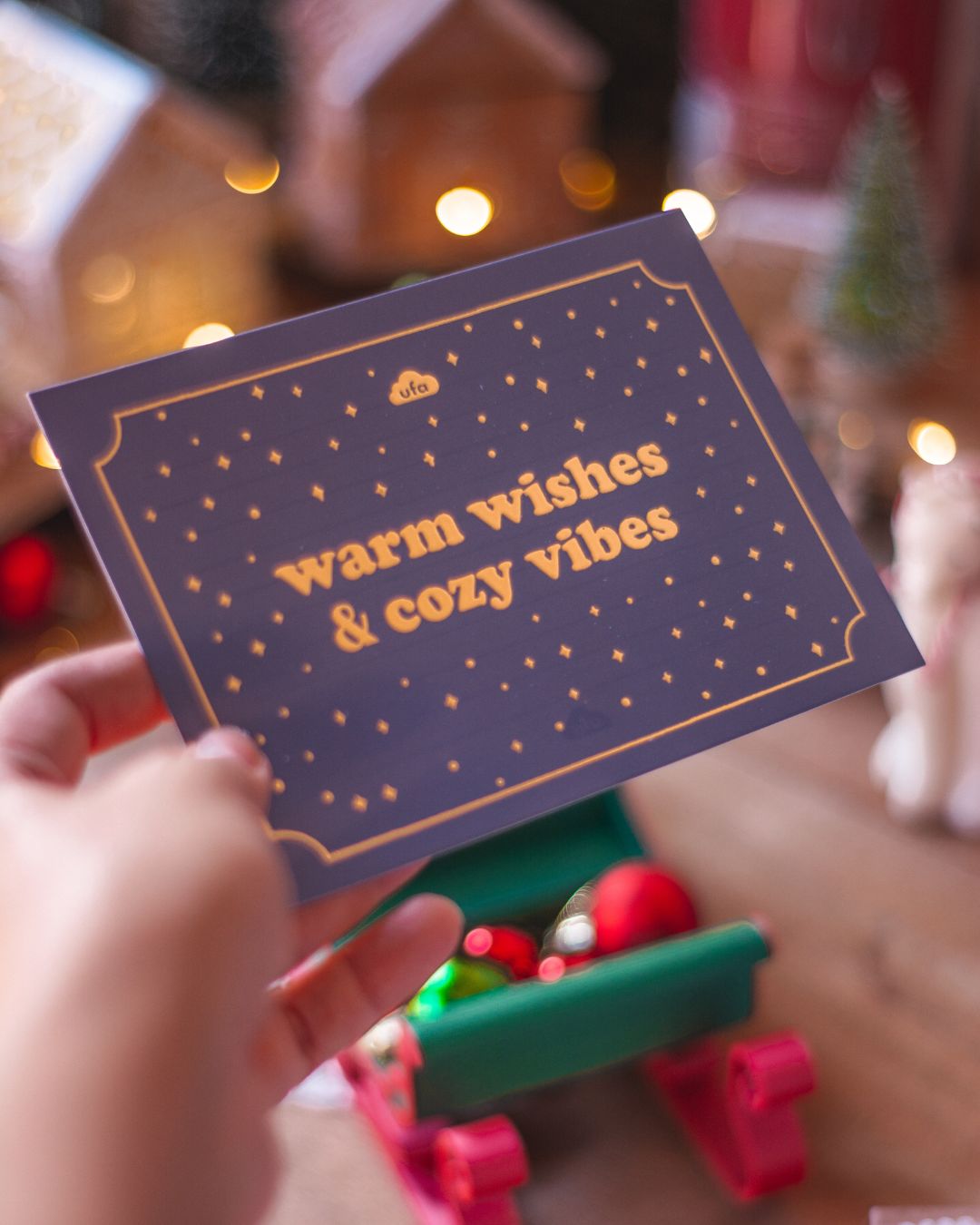 Na frente, a frase “warm wishes & cozy vibes” aparece em hot stamping dourado, trazendo um brilho suave que aquece o olhar. A expressão significa “desejos calorosos e vibrações aconchegantes” — exatamente o que queremos transmitir ao presentear alguém que admiramos, gostamos ou queremos bem. Um desejo bonito, adulto e afetuoso, sem exageros.