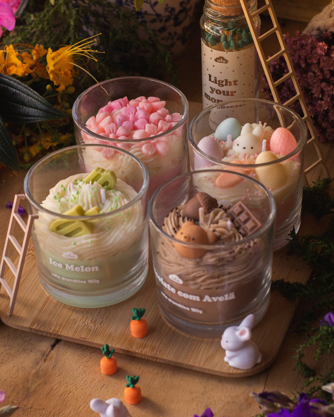 Este kit inclui as quatro velas da coleção, cada uma com uma personalidade única: