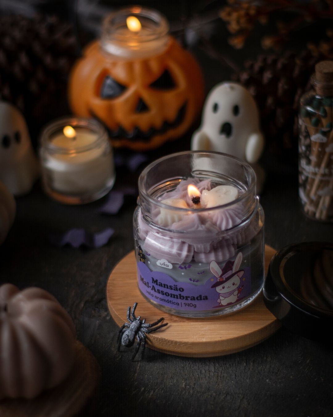 A vela Mansão Mal-Assombrada tem a fragrância amadeirada e balsâmica, que lembra uma confortável mansão com a lareira acesa. Os fantasminhas no topo da vela são uma assombro à parte e, como todo bom fantasma, eles brilham no escuro! Porém, ao acender a vela, a fosforescência se esvai com os fantasminhas.