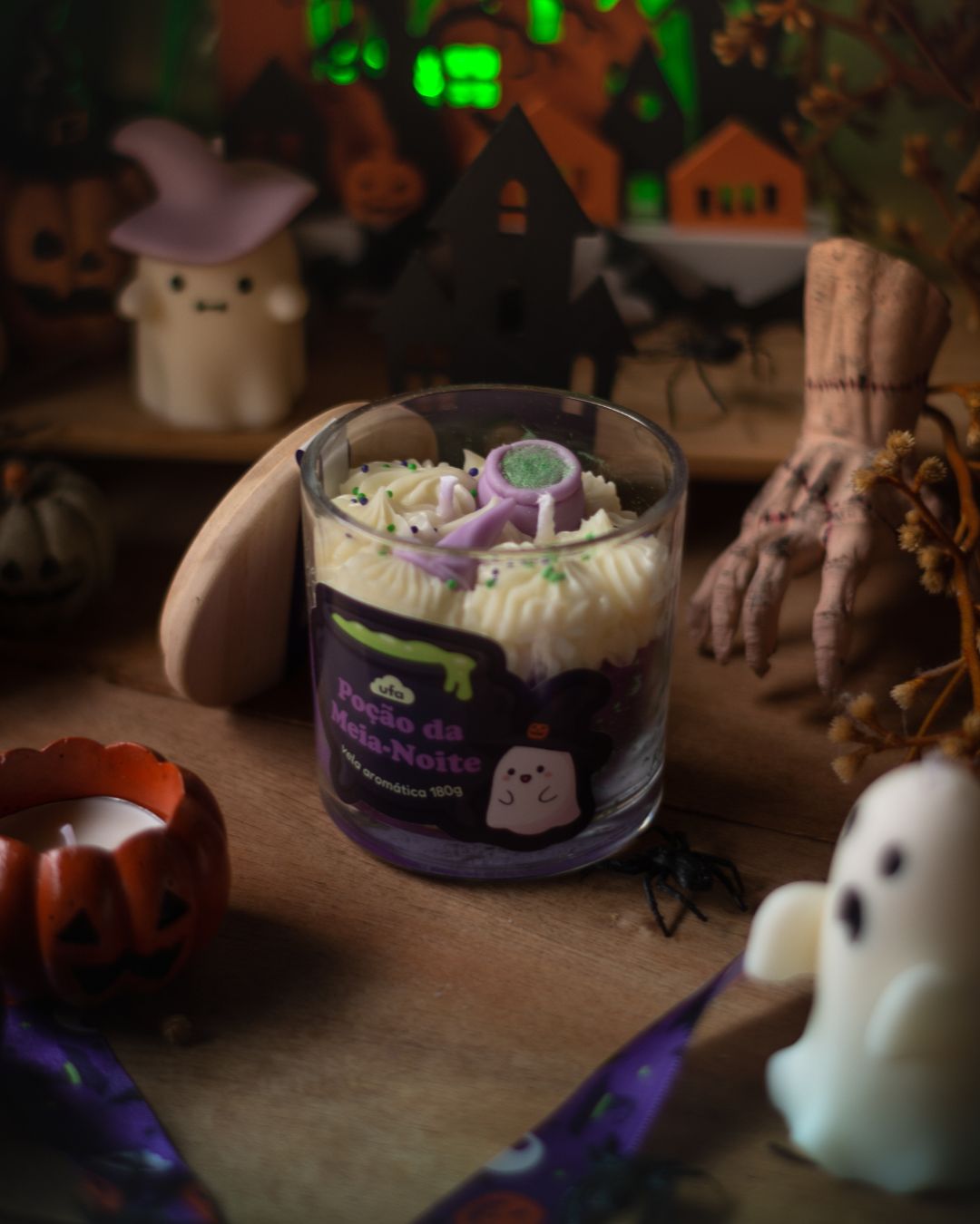 Essa vela especial tem uma camada de chantilly de cera (isso mesmo, cera em forma de CHANTILLY) e uma decoração com caldeirão e chapéu de bruxa. Ao acender a vela, você perceberá as partículas brilhantes na cera derretida. Uma verdadeira magia!